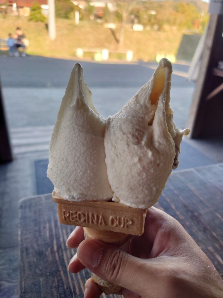時間的に夜には急激に寒くなるし早めの移動と島根を後にゆっくり遠回りして南下、1時間半かけて上野原牧場カドーレジェラテリアへ。人気No.1のしぼりたてミルクとラムレーズン。