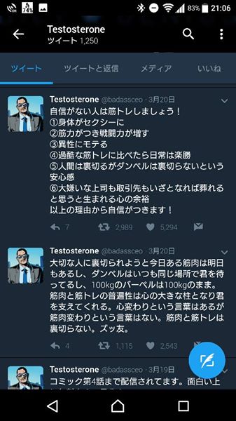Twitter 雑談その他 X Facebook コピー 2017.04.082023.09.09 今更ですが僕はTwitterもしています。 ただ情報発信はしておらずただ一人の方をフォロワーで見るために。 その方は「テストステロンさん」 筋肉は我が命&プリケツ大好きメンです。 名言がかなり凄いです、おすすめですw そんなテストステロンさんが4/7に本を出しました♪ アマゾンで今日早速ポチりましたw