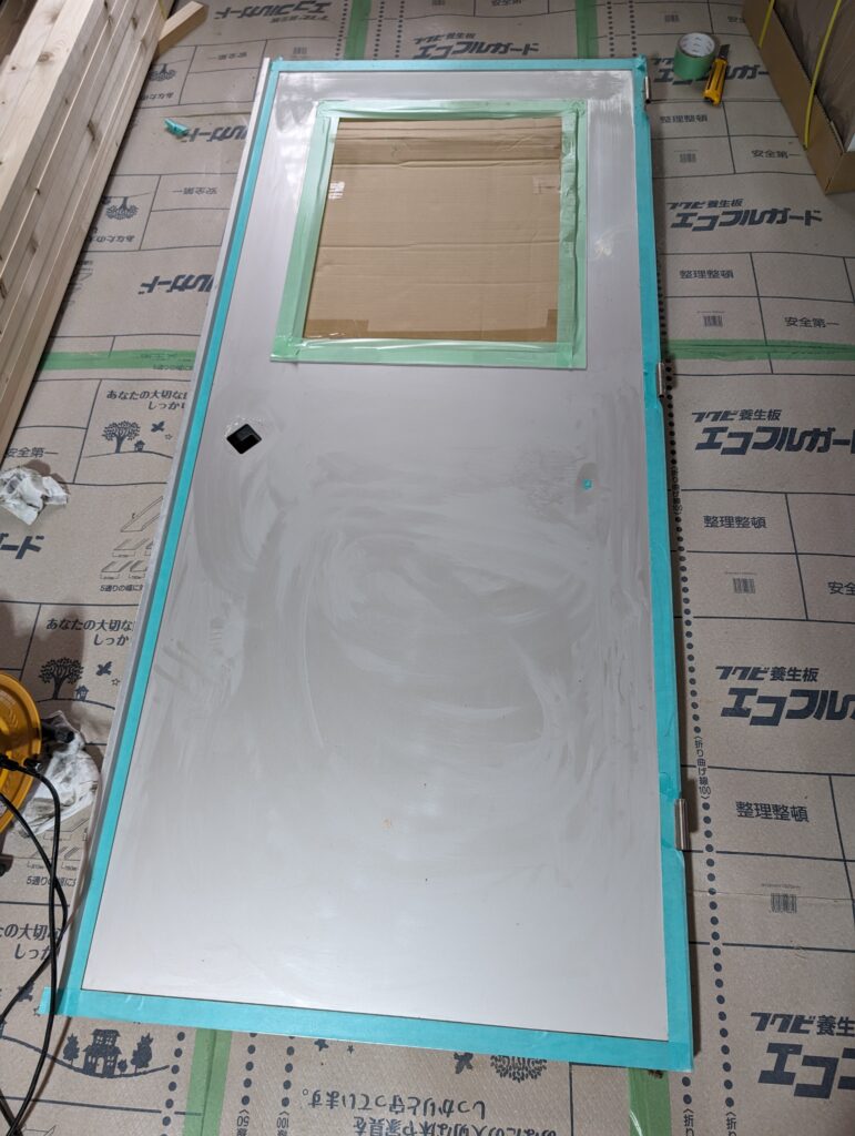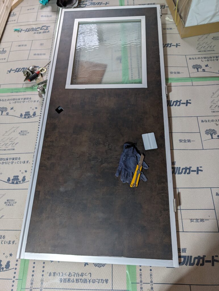 そしてこれを2Fの使ってない部屋から移設。ドア枠がガッツリ埋め込まれているらしくかなりの重労働。その間僕は外したドアのダイノックシート張り。