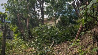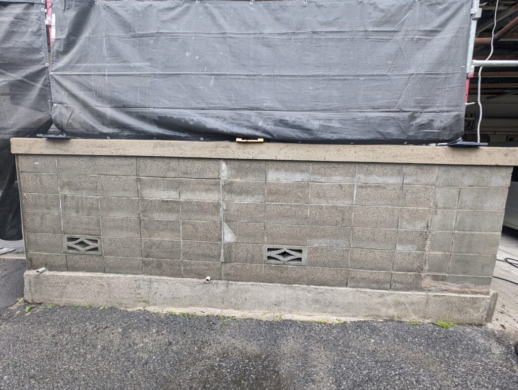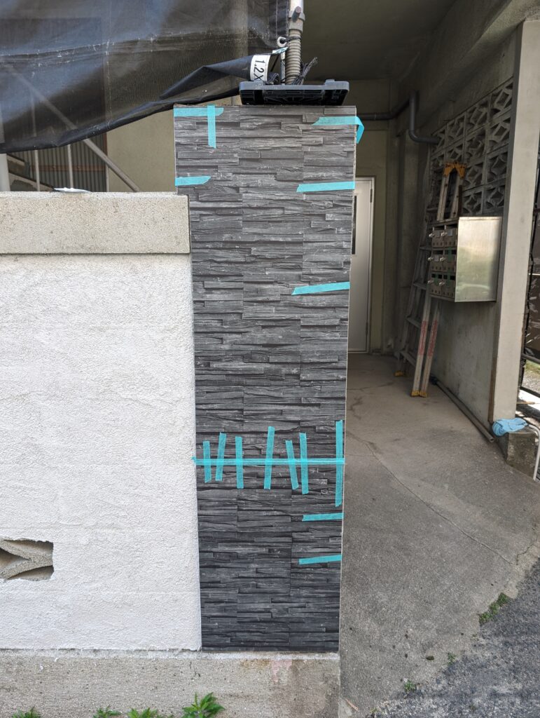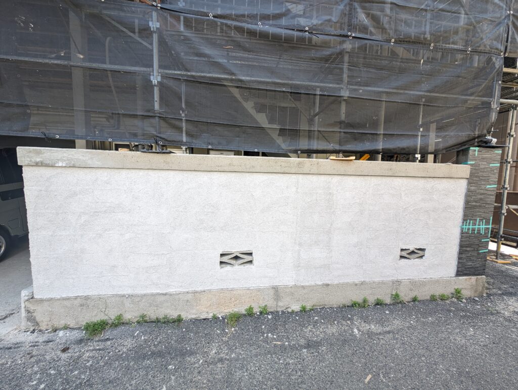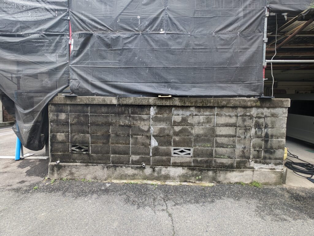 こちらは右側ですがこんな感じに。ここまで高圧洗浄、クラック補修、目地埋めまでしての2度塗りです。花ブロックはこの後モルタルを詰めて上から塗り潰す予定です。(当然裏側もやるのですが今解体後のゴミが散乱しまくってるので片付け後)ちらっと写っていますが右側。こちら元々アパートの看板がついていたのでくっきりあとが残ってます、清掃しても落ちきらないので4年前に事務所改装で使って余ってたエバーアートボードを。
