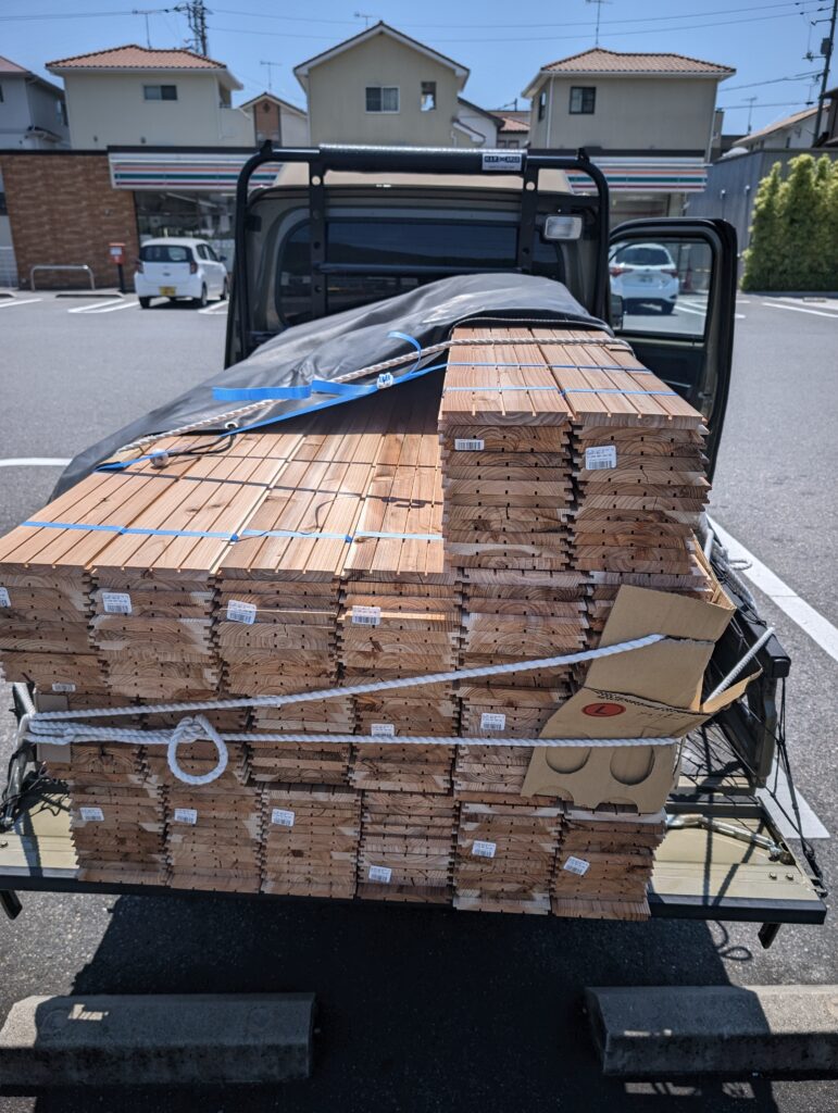 三笠の方はやればやるほどトラブルが出る(主に外回り)ですがまあそれはしゃーないw2Fはどうにか今月末に終わりそうだけど7月までに全部終わりにしたいなあ。。。当初より2ヶ月伸びてる🥺僕はというと相変わらず雑用メインwこの時はフロア材仕入れから。20坪欲しいとの事で会計後リフターで20坪分荷台に積んで貰いロープを。積載オーバーかと思ったが1枚≒1.4キロ位で1坪12枚って≒336キロか。まあ最大積載量:詰めるだけなんだが😤