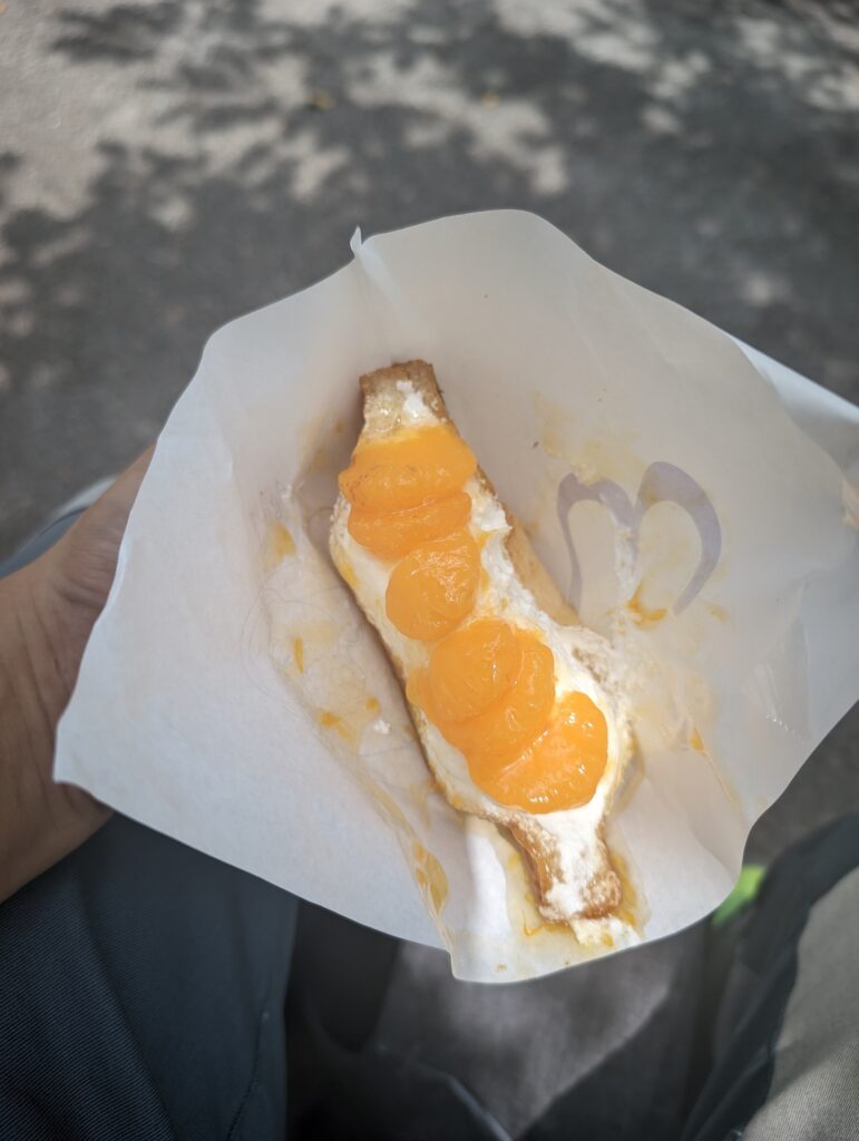 どうにか到着しまずは腹ごしらえと銀座へ。羽田空港から品川駅−銀座行こうと京急乗ったはいいが次の泉岳寺で乗り換えて。。。とわざわざ降りる。相互乗り換えで直通なのにね。さすが魔都TOKYO🥺それでも気合で到着。この日はage.3GINZAさんへ。揚げパン専門店って事でみかん、はちみつレアチーズをGet。めちゃくちゃ甘く美味しい、美味しいんですが1個で胸焼け、2個はきつい🥺(買ったのお前定期)お食事系揚げパン1つ買えば良かったwww美味しゅうございました☺
