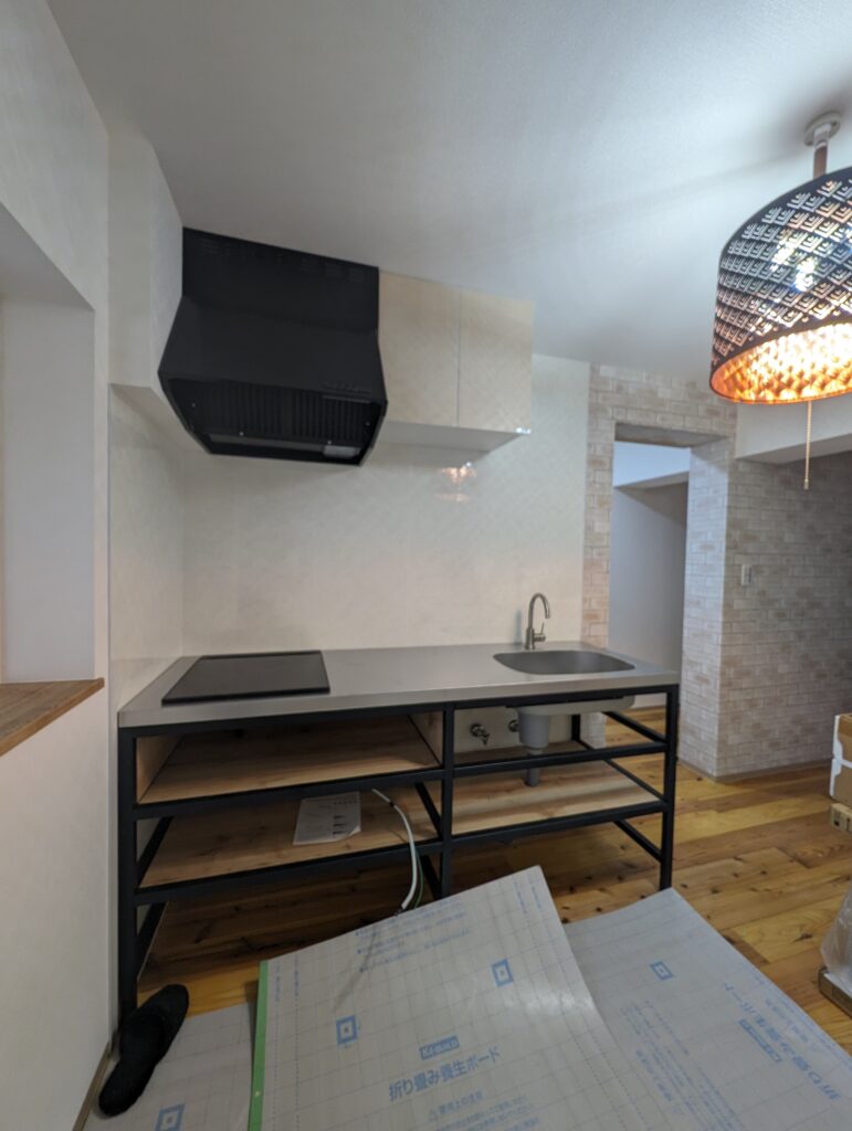 ほぼ同時進行でキッチンを。これがねえ良くできてるんですよ。ただね、エアコンの設置してないので室内くっそ暑いwww途中制作の画像はもう省きますけどもw火災防止にIHコンロにしてあります。キッチンパネル他は大工さんに。あ、ちなみに言っておきます。キッチンは一切僕触れてません設備屋さんです、後ろでぼちぼち手伝いだけでしたw