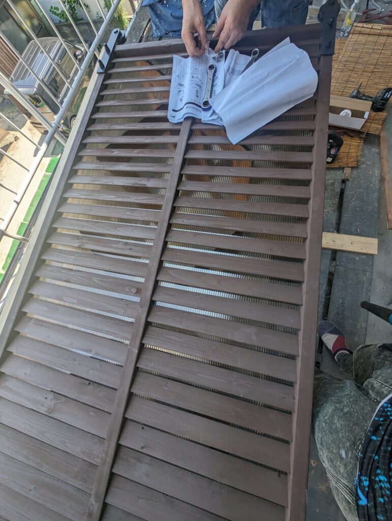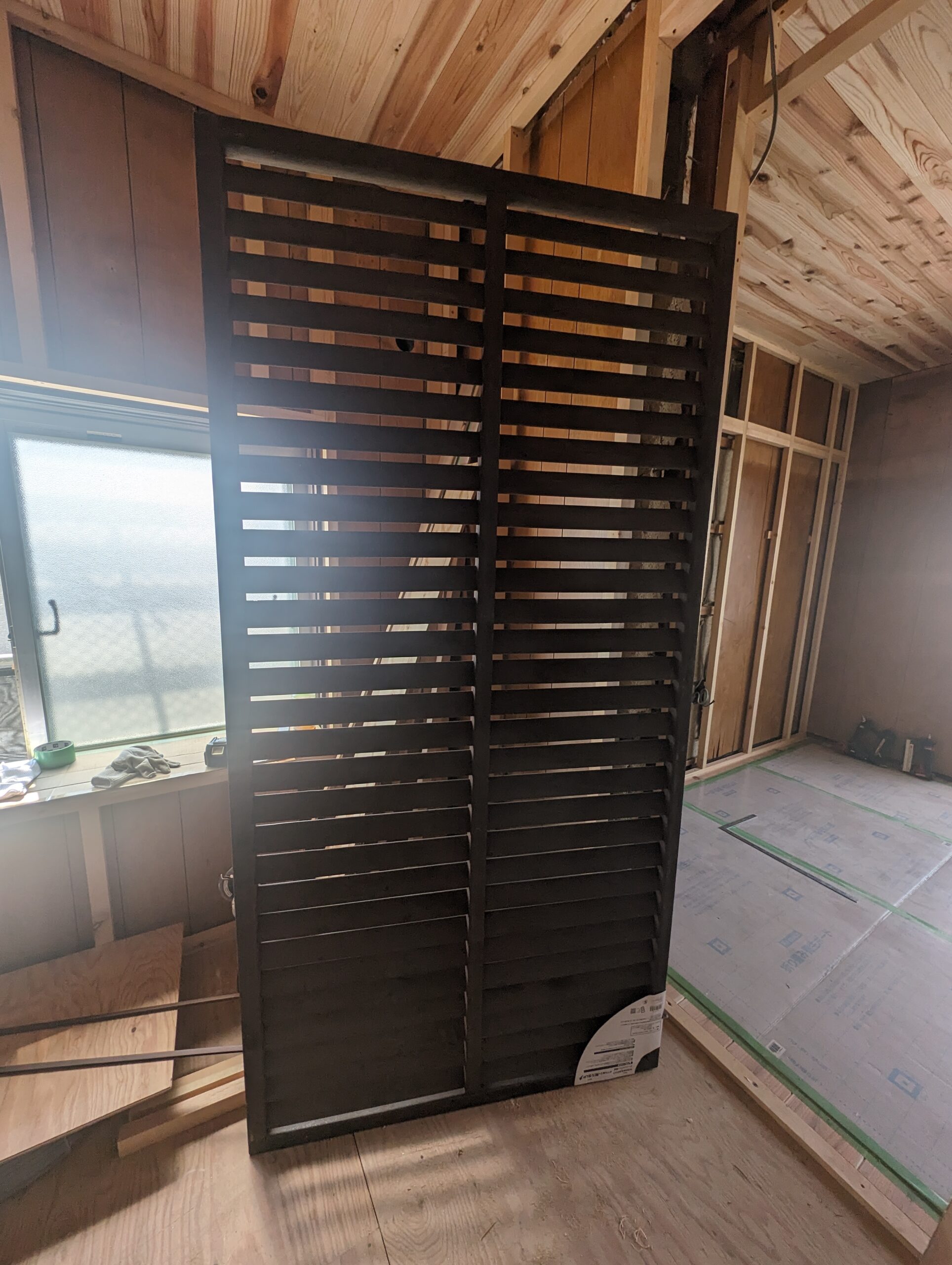 園芸などに使われるフェンスや柵のルーバーラティス☺ルーバーになっている&骨組みはこれSPFかな?結構軽いです。写真のようにまあ目が大きいルーバーなので向こう側が見えないように加工が必要です。
