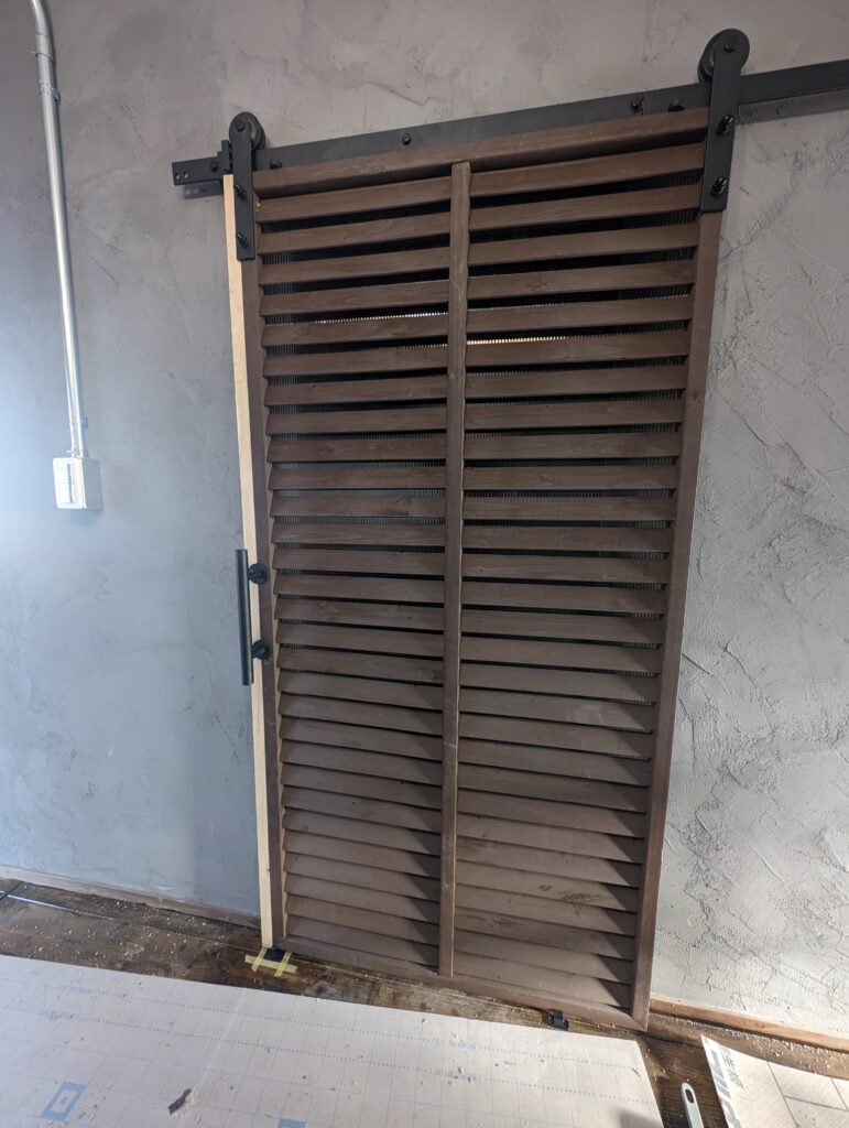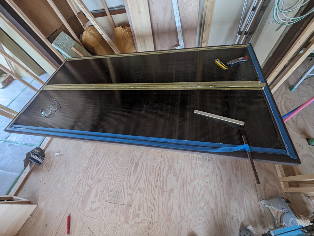 そこで買ってきたのがポリカーボネート板。まっすぐカッターで切ってはめればいいかと思いましたが微妙に、しかも左右大きさ違うトラップに引っかかり何度もやり直し、ここの調整に2時間近くかかりました。何とかはめ込みコーキング打ちました。この後はドアの取手を取り付けです。前もってAmazonで買ったバーンドア用取っ手を取り付け。ですがこれ。。。炭素鋼の取っ手が大きくてフチの木材よりはみ出る🥺