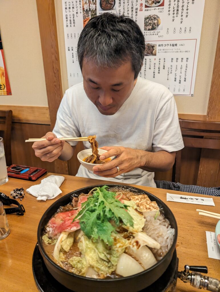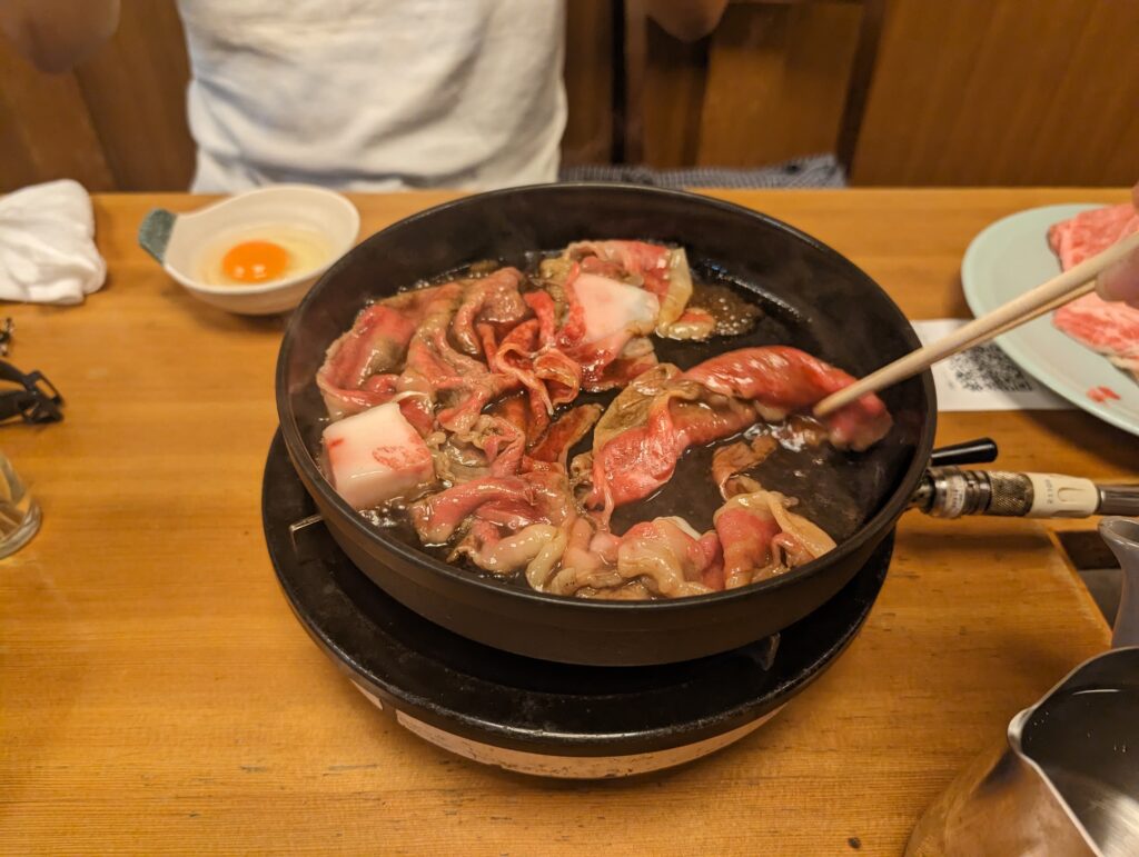 このA5のお肉をですね、店員さんがまずは1枚焼いてくれまして卵をつけて実食。もう本当贅沢🥺w凄いもう美味しいのよこれが!(ボキャ貧民)食べてる間に野菜と肉を再度加えて割り下作成😤これはアカン、ごはん何倍でも行ける奴やwww自制心でごはんは小にしましたけど本当これはギルティですわw