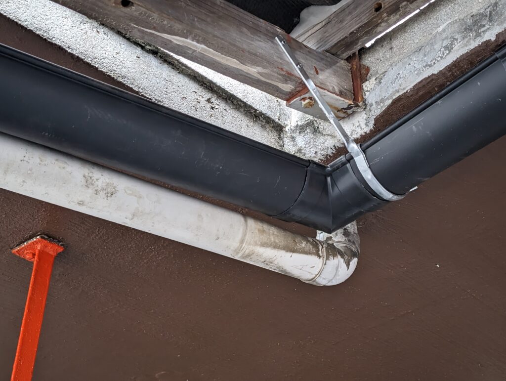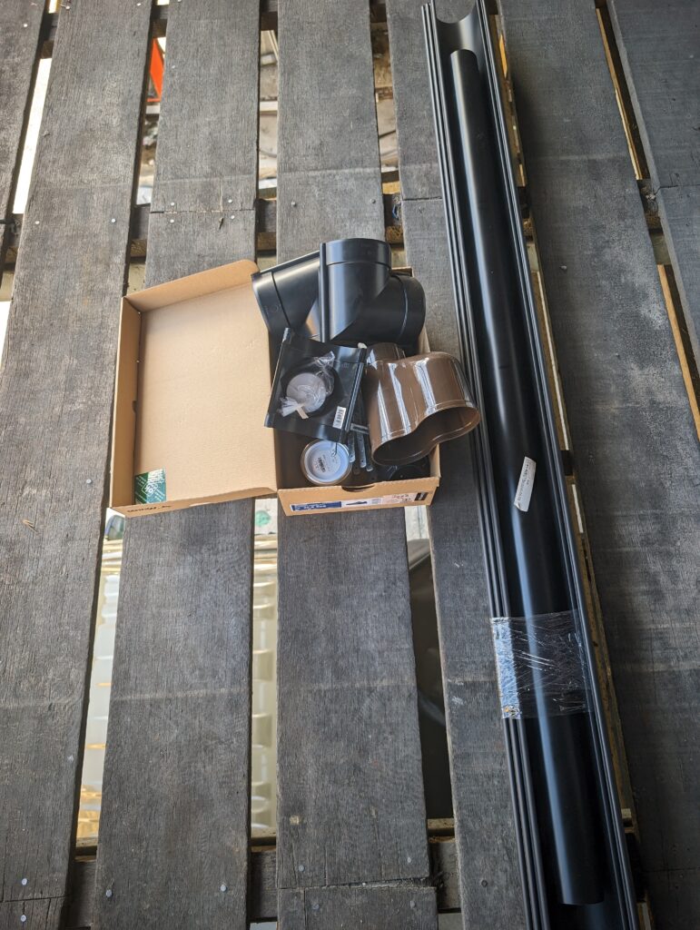 縦樋軒樋やら集水器パーツ15000円ほど、これらを1日かけて設置。曲がり部分からの勾配が取りにくい&3Fからの排水が丁度重なる部分をうまく迂回しつつ合流させるのに一苦労。樋は後日塗装予定です。
