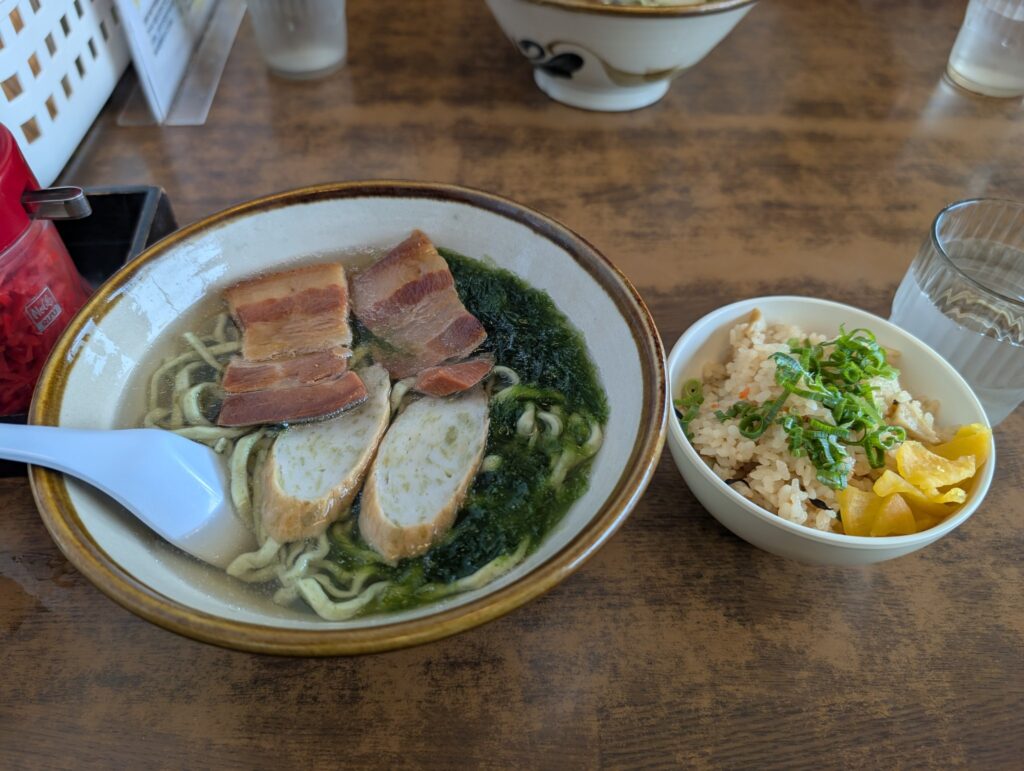 夜はステーキを食して就寝。そして最終日。なかむらそばへ。早めの11時に来たら僕らで満席。1番人気のアーサそば+ジューシーを。練り物と麺にアーサが練り込んである!これが凄く美味しい。ジューシー≒炊き込みご飯みたいな感じでこれがまた絶妙な味付け、美味しゅうございました☺