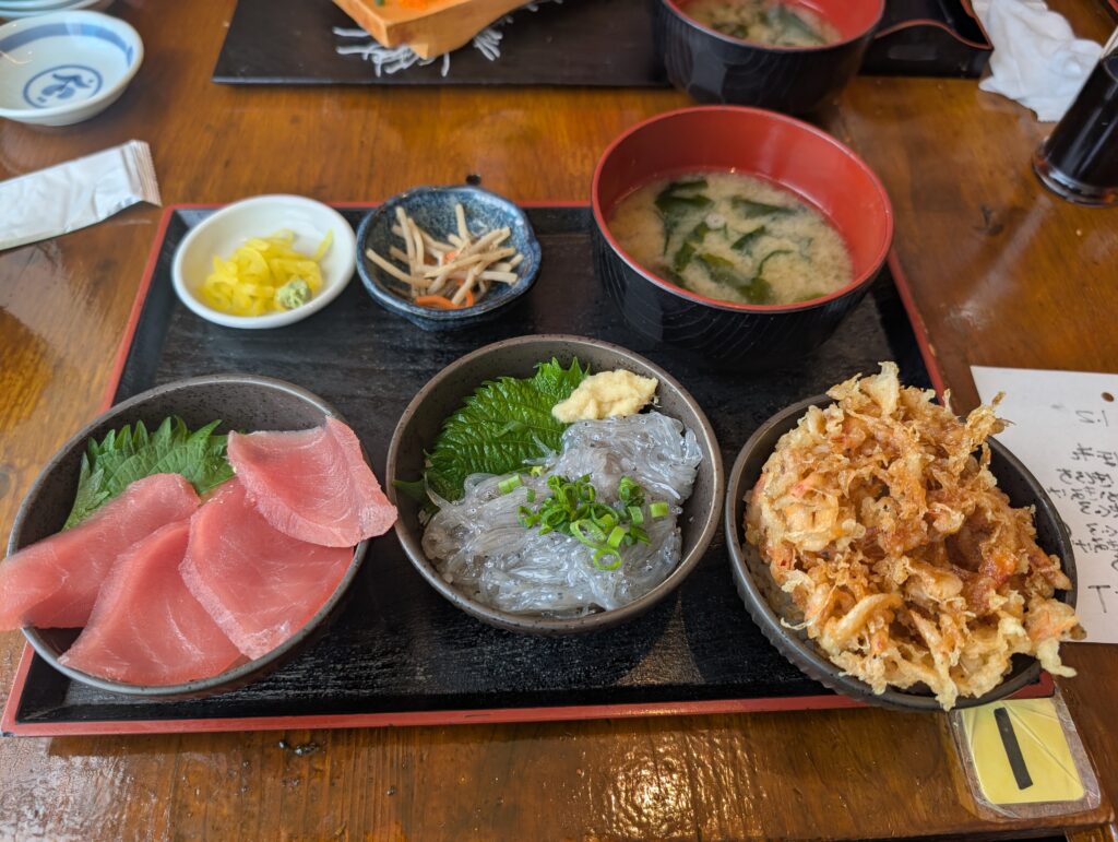 朝食を取ってシャワー浴びたり色々準備。今度は清水港へ。ちょっと早めの昼食で3色丼。マグロ、生シラス、桜エビのかき揚げそれぞれミニ丼で。おいひいれす😀