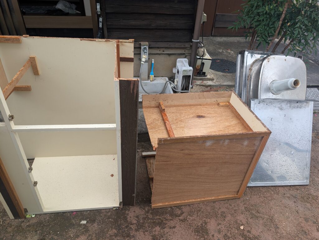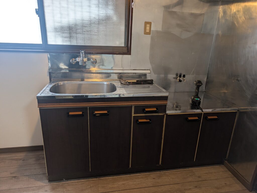 この手の公団タイプのはコーキングでつけてるだけなのでバラすのは簡単。キレイに掃除してキッチン解体して廃棄。