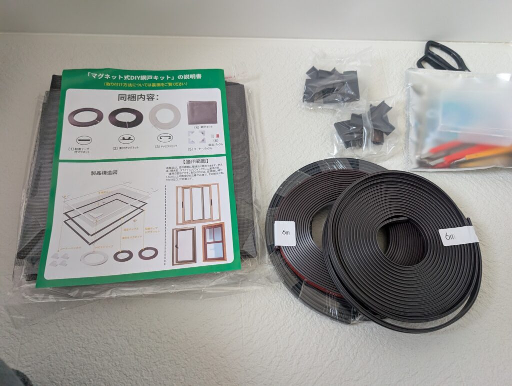 写真の後付け網戸が本当よく出来てる。市販品でマジックテープ奴は売ってましたので過去使用したこともありますが何度も取り外してるとテープが駄目になるんですよね。その点こいつはマグネットなので半永久的に使えると。キット自体もさほど難しくなく初心者でも窓1枚1時間ちょっとで出来ます、必要なものはハサミとカッターだけでお手軽。