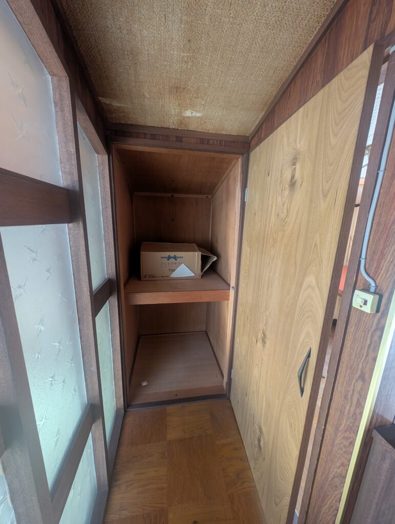 元々は2畳位の収納後付けで照明付けたみたいな感じ。廊下突き当たりには0.5畳の収納。これらを扉撤去して廊下含みで解体して3畳にしてドアを新設しようという考え。んで解体。