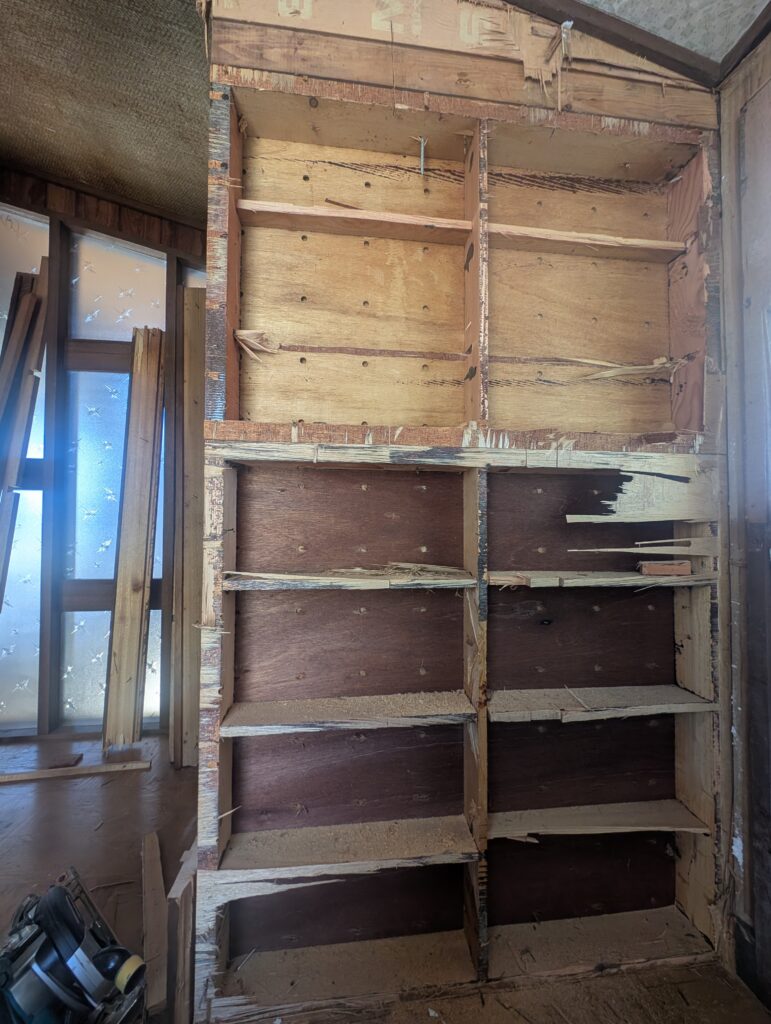 前回前述の通りミサワのお家で収納壁壊してると本当しんどい。これでもかというほどがっちりボンド塗りたくった上でビスや釘山程打ってるのでこりゃあちょっとやそっとじゃ壊れないわと思いました🥺(意訳解体業者やDIYer泣かせなお家です)そんなこんなでまあスペースもそんなでもなかったので半日で片付けまで終了。