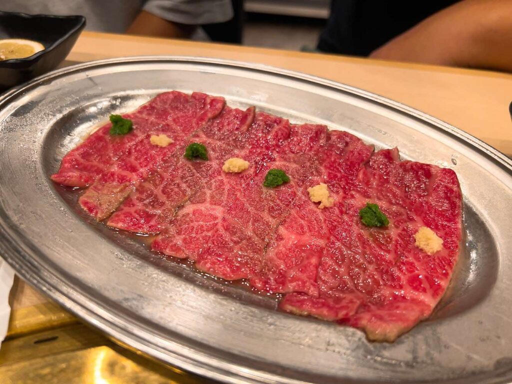 生肉ユッケからスタート。「今日は米食わない」の違いを秒で改めさせるwwwすんごいねっとり食感で卵黄と相まってもうこれだけで延々と食べれるレベル。