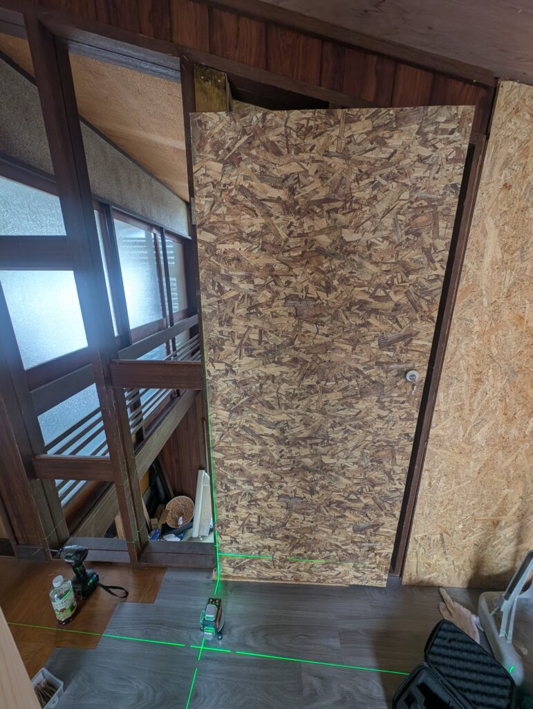 壁枠の水平取りつつまずはドア設置位置の調整。この上でドアラック付けて枠を造成。