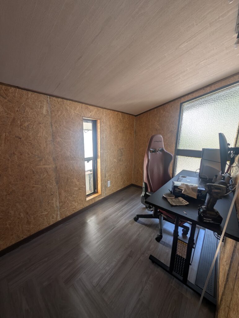 昨日部屋自体は完成していたので既に入居者さんが専用の机とPC、ゲーム持ち込んでました。「快適過ぎます誰にも気にしなくていいし」と喜んで頂けました。ドア以外はアドバイスに留め部屋のOSB板他は本人にやらせたので思い入れひとしおだと思います。まぁフリーハンドで切っててガッタガタなんですけどねwww本人良ければそれでよし😤