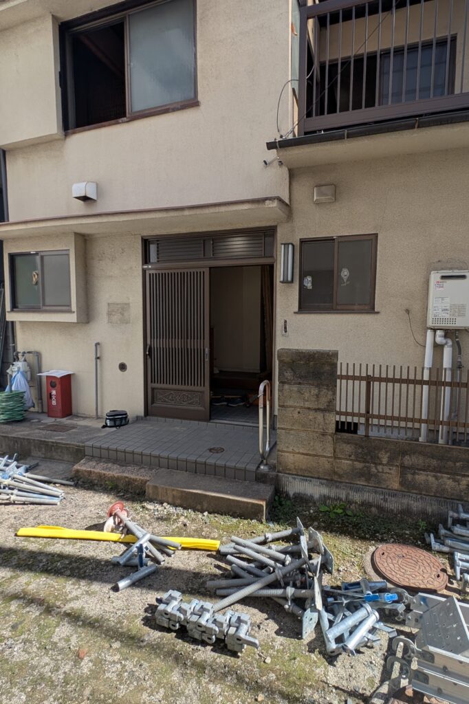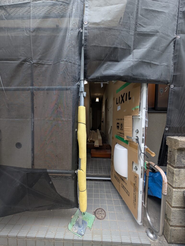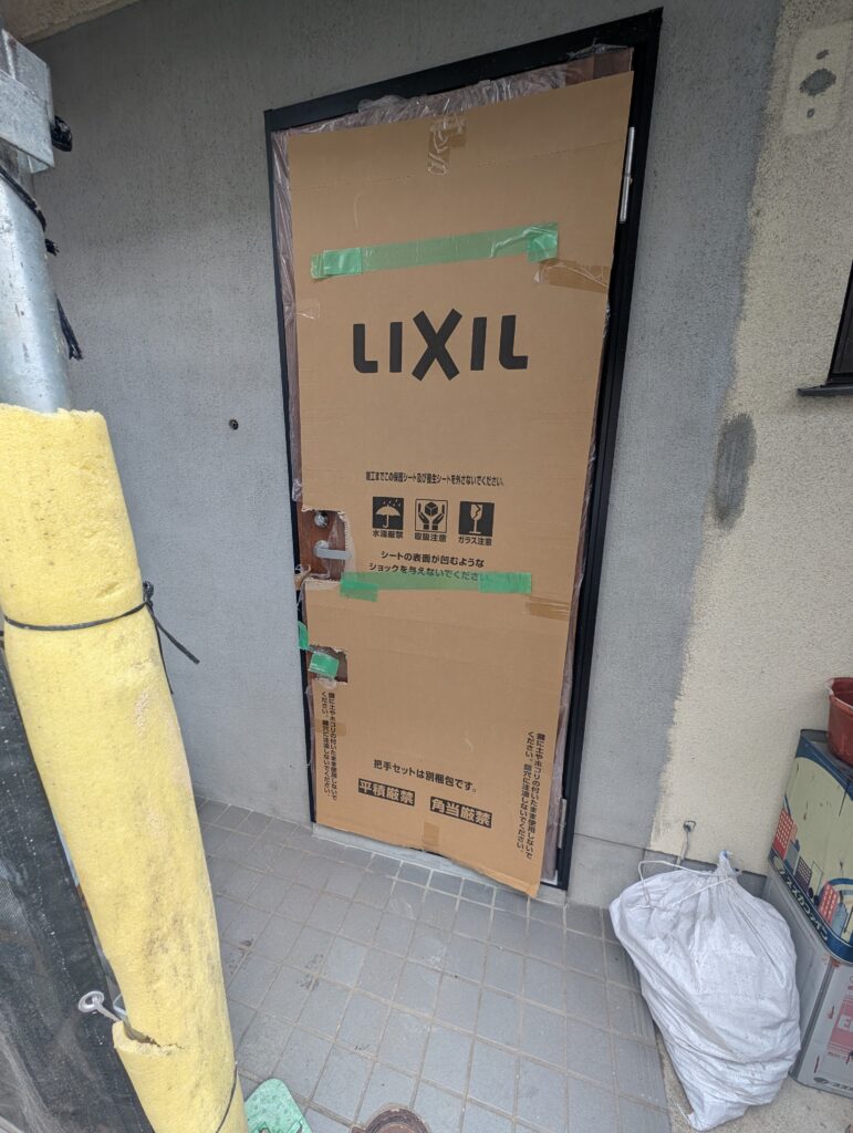 ちょっと足場かかって見づらいですがこんな感じに。バラシから取り付け、左官まで1日かからずここまでやるとか流石プロです。