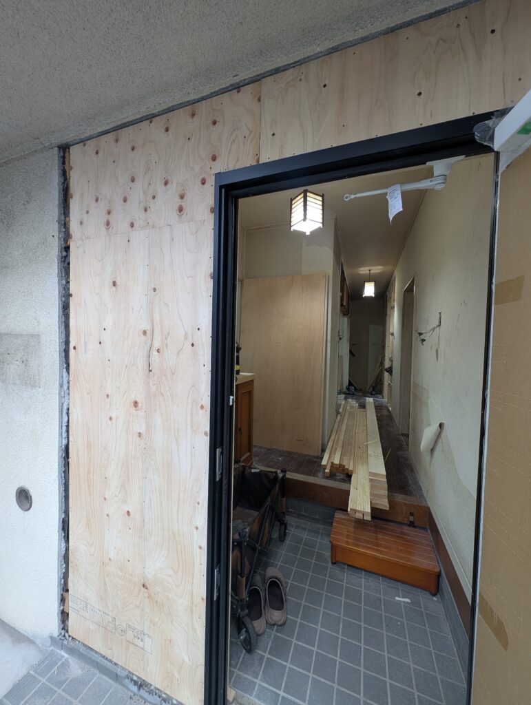 うちの西蟹屋。この手の引き戸タイプはスイッチボットが付けられない(厳密に言うと3Dプリンタのパーツを別途買えば付けれなくはない)のとイメージが違うということで開き戸タイプに交換。次いで玄関灯やインターフォンの位置も変更。