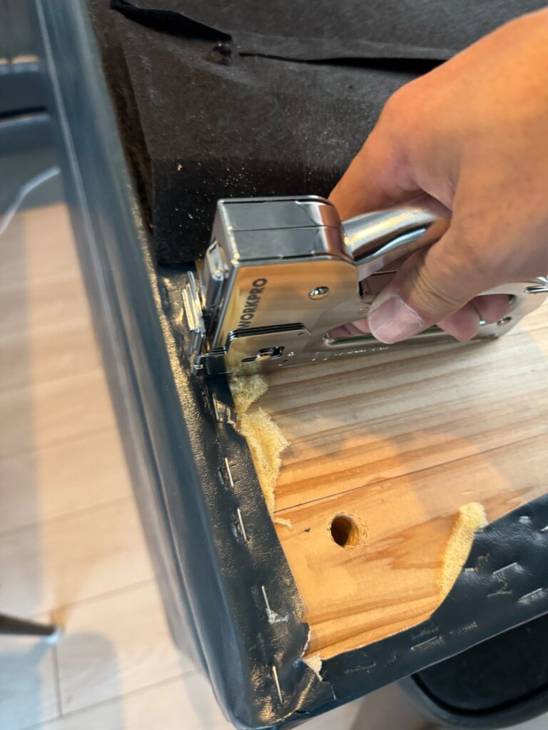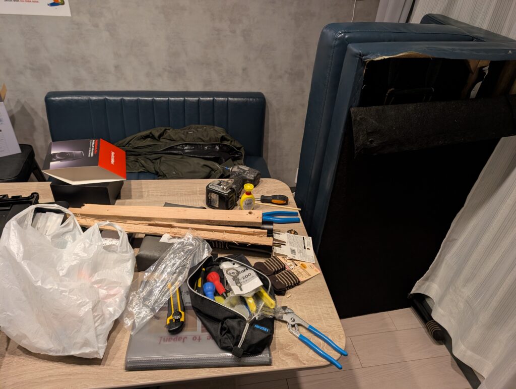 ホームセンターも3日からなのでこの日は終了し後日。適当に板を加工し、穴を空けてガンタッカーで生地を貼り付け。