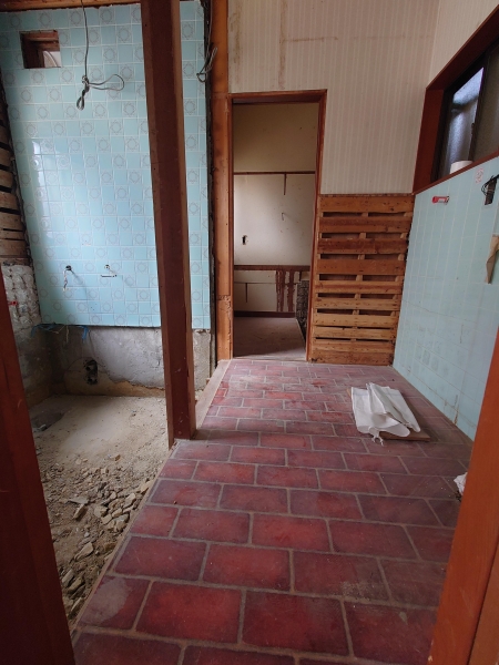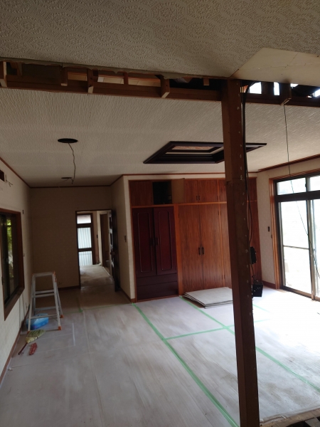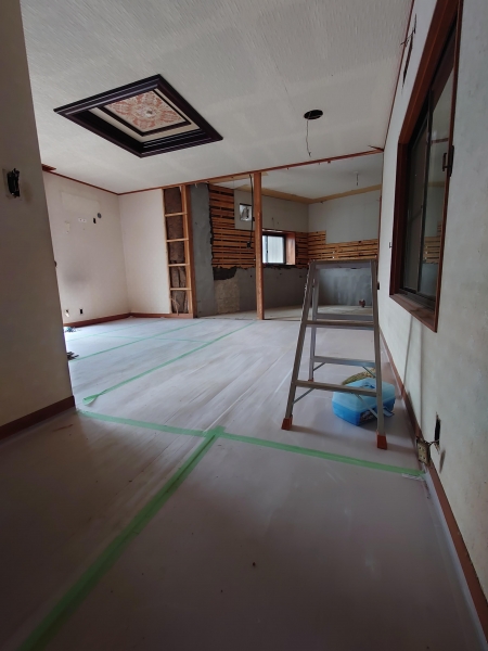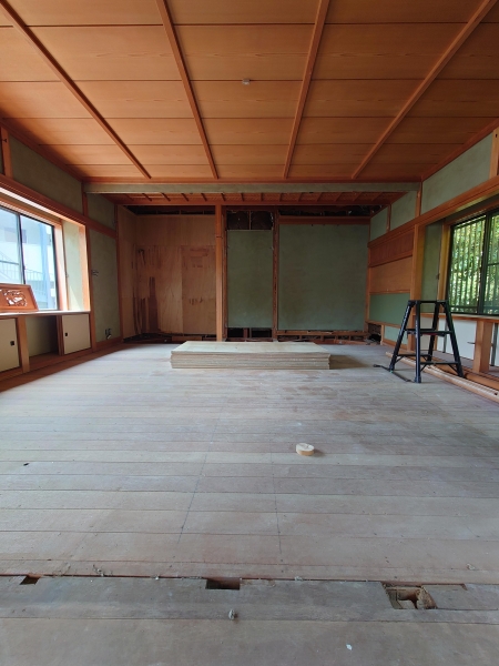 スケジュールでは今日も解体している予定だったので差し入れと施主支給のフローリング材を持って現場へ。